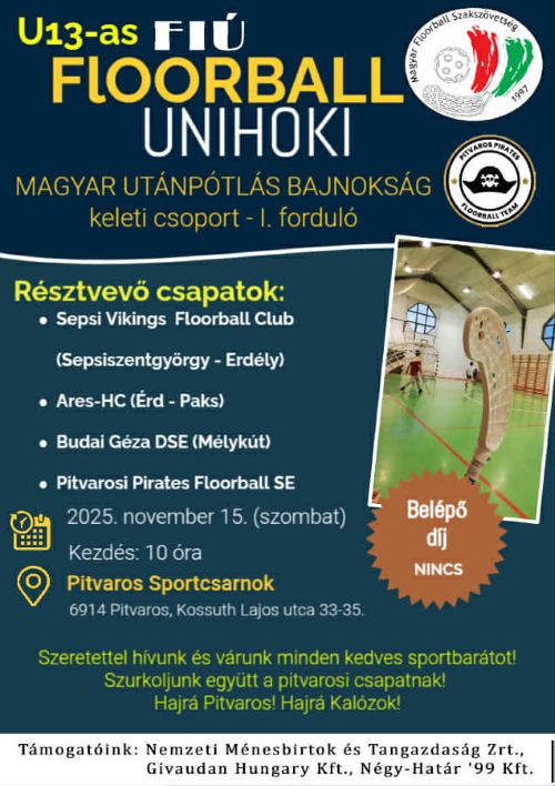 Szombaton a legtvolabbi helysznen, Pitvaroson kezdi a szezont U 13-as fi csapatunk. A bajnoksg nyolc csapatt keleti s nyugati csoportra osztottk. Mi keleten a Sepsi Vikings, a Pitvaros Pirates s a Mlykt ellen jtszunk az alapszakaszban. Nyugaton a Vajda CH, a Phoenix, az SZPK s az ATTE Remete jtszanak. A csoportok els kt helyezettje az rmekrt, a 3-4. helyezettek az 5-8. helyrt folytatjk.